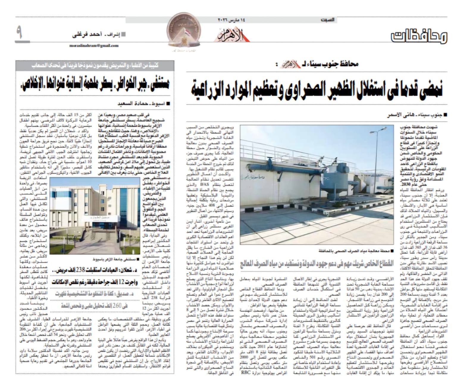نشرت جريدة الأهرام في عددها الصادر يوم السبت 14 مارس تقريرًا صحفيًا موسعًا سلط الضوء على الدور الطبي والإنساني الذي تقوم به مستشفى جامعة الأزهر بأسيوط في تقديم الرعاية الصحية المتكاملة لأهالي صعيد مصر.