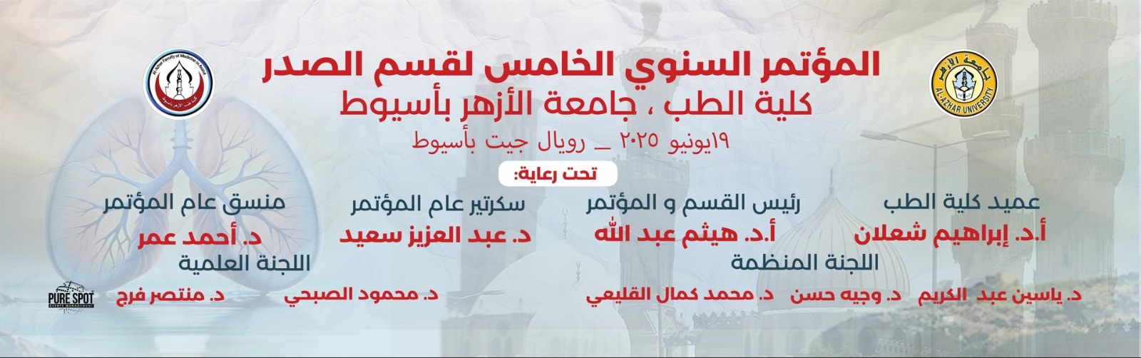 تحت رعاية فضيلة الإمام الأكبر الاستاذ الدكتور أحمد الطيب شيخ الأزهر،،، وفضيلة الأستاذ الدكتور سلامة داوود رئيس جامعة الأزهر ،،،ومعالي الاستاذ الدكتور محمود صديق نائب رئيس الجامعة للدراسات العليا والمشرف العام على قطاع المستشفيات ،،،وفضيلة الأستاذ الدكتور محمد عبد المالك نائب رئيس الجامعة للوجه القبلي ،،،والاستاذ الدكتور إبراهيم شعلان عميد الكلية ورئيس مجلس إدارة المستشفى الجامعي ،،،والاستاذ الدكتور محمد منير ريان وكيل الكلية لشؤون التعليم والطلاب،،، والاستاذ الدكتور هيثم عبد الله رئيس القسم ورئيس المؤتمر