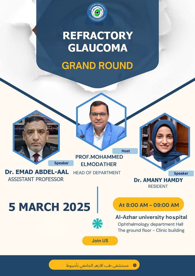 بمشيئة الله تعالى سوف يتم عقد يوم علمي بقسم طب وجراحة العين بطب الأزهر بأسيوط يوم الأربعاء الموافق ٢٠٢٥/٣/٥ بعنوان “المياه الزرقاء المقاومة للعلاج”