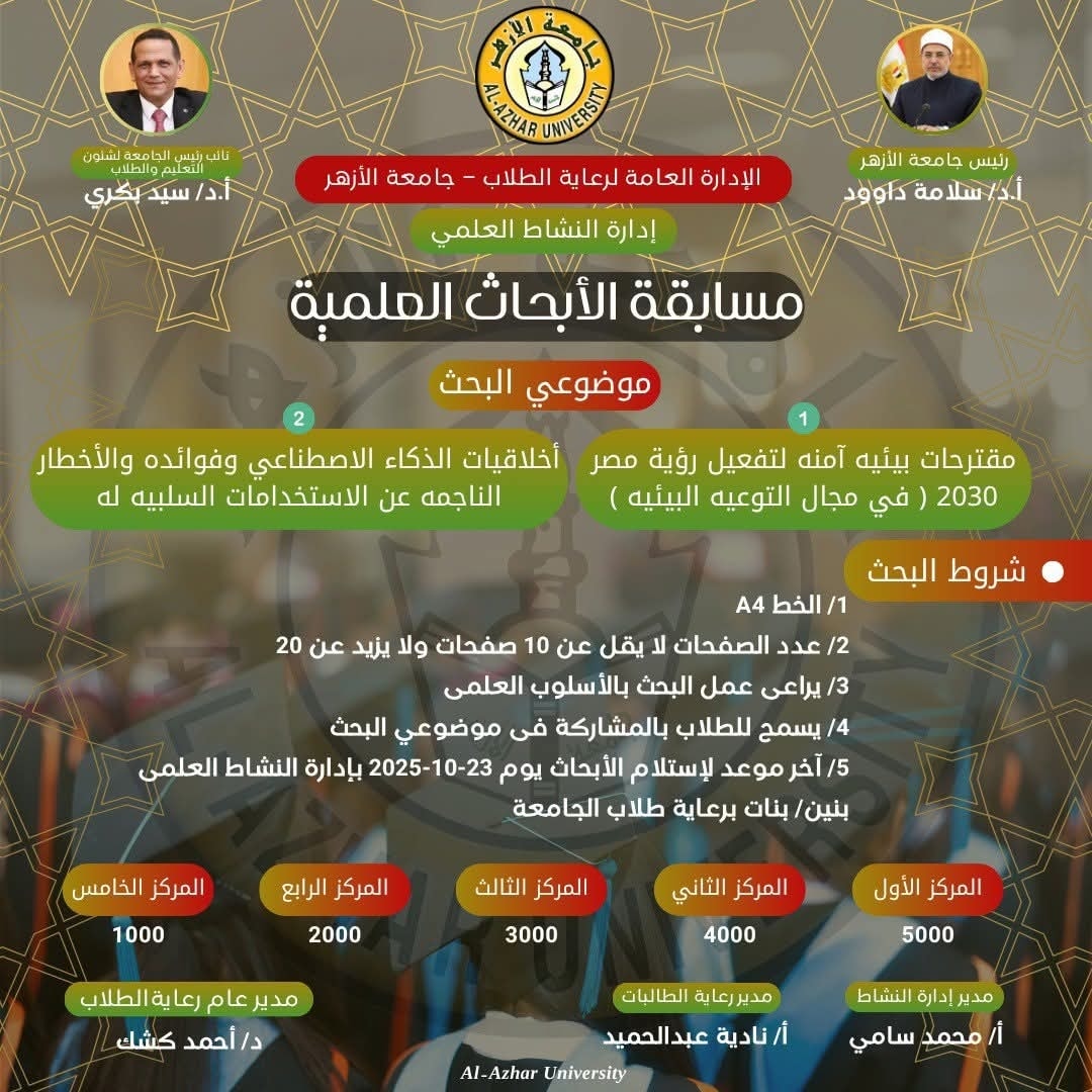 تعلن رعاية الطلاب بجامعة الأزهر عن بدء مسابقة الأبحاث العلمية لطلاب الجامعة بالقاهرة والأقاليم.