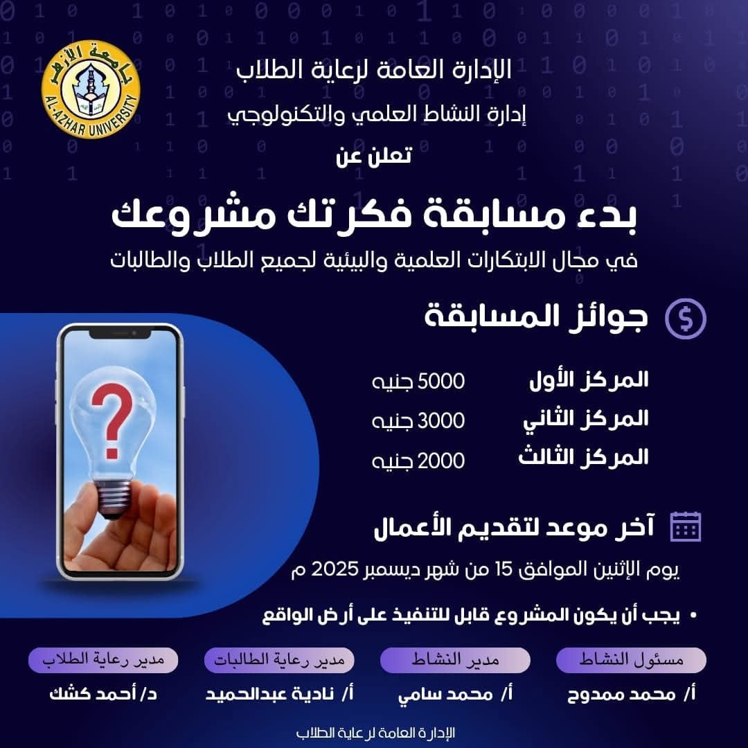 مسابقة فكرتك مشروعك تقام برعاية فضيلة الدكتور سلامة جمعة داود رئيس الجامعة، والدكتور سيد بكري نائب رئيس الجامعة لشئون التعليم والطلاب، والدكتور مصطفى عبد الغني نائب رئيس الجامعة لفرع البنات وشئون الوافدين.
