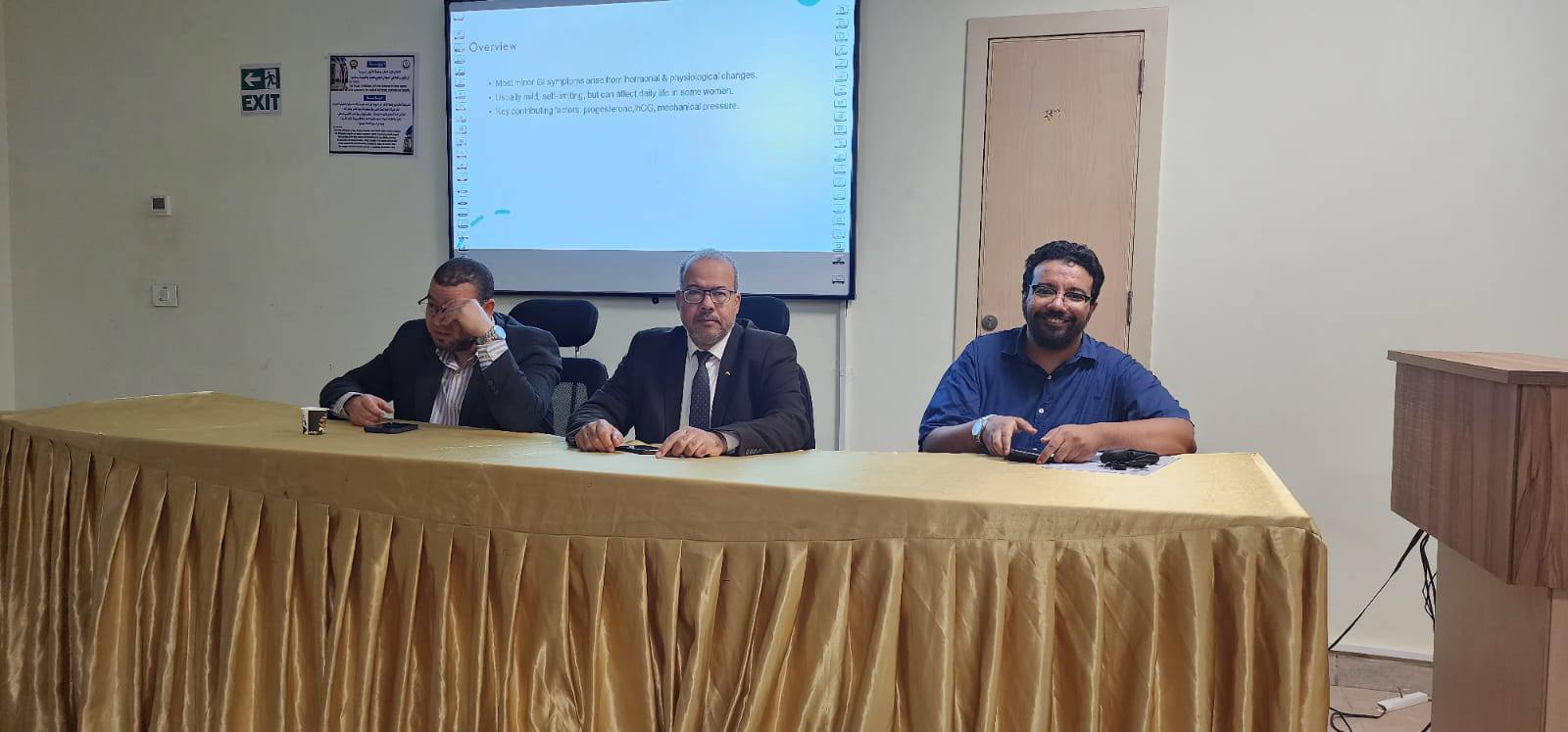 المحاضرة الأولى قام بالقائها الدكتور عبد الرحمن ماهر المدرس بقسم التوليد وأمراض النساء بطب الأزهر وكانت عن مختلف الأعراض الهضمية والمعدية و التى قد تعانى منها السيدة الحامل وأولها هو الغثيان الحملى أو غثيان الصباح وهو الذى يصيب أغلب السيدات الحوامل فى الشهور الاولى وبين الفرق بينه و بين القيئ المستعصى أو المفرط ، وبين أهمية طمأنة السيدة الحامل بأن هذا الغثيان من ضرورات الحمل وان أغلب الحالات لا تحتاج إلى علاج دوائى وانه يكفى بعض التغييرات فى طريقة تناول الطعام مع تجنب الأطعمة التى تحتوى على مواد مهيجة لبطانة المعدة وتناول عدد وجبات اكبر مع كميات أقل ، ثم تناول اسباب حدوث الإمساك وطرق علاجه وكذلك التقلصات المعدية والمعوية وكذلك ما يعرف بحرقان المعدة والناتج عن ارتجاع الحامض المعدى إلى المرئ.