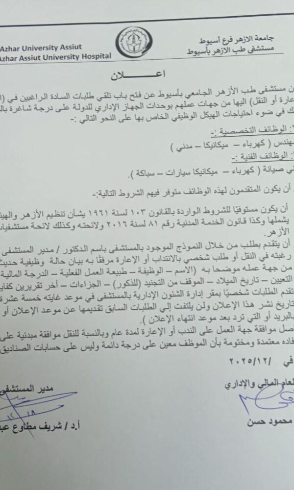 إعلان هامMakramshafeiديسمبر 22, 2025إعلان هام تُعلن مستشفى طب الأزهر الجامعي بأسيوط عن فتح باب التقدم للندب ... اقرأ أكثر