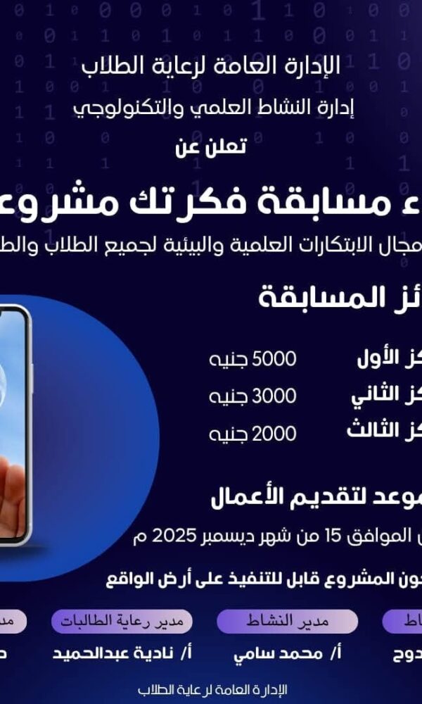 مسابقة فكرتك مشروعكMakramshafeiنوفمبر 15, 2025مسابقة فكرتك مشروعك تقام برعاية فضيلة الدكتور سلامة جمعة داود رئيس الجامعة، والدكتور ... اقرأ أكثر